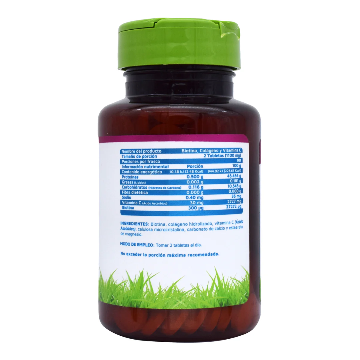 Ingredientes: Biotina, colageno hidrolizado, vitamina C, celulosa microcristalina, carbonato de calcio y estearato de magnesio.