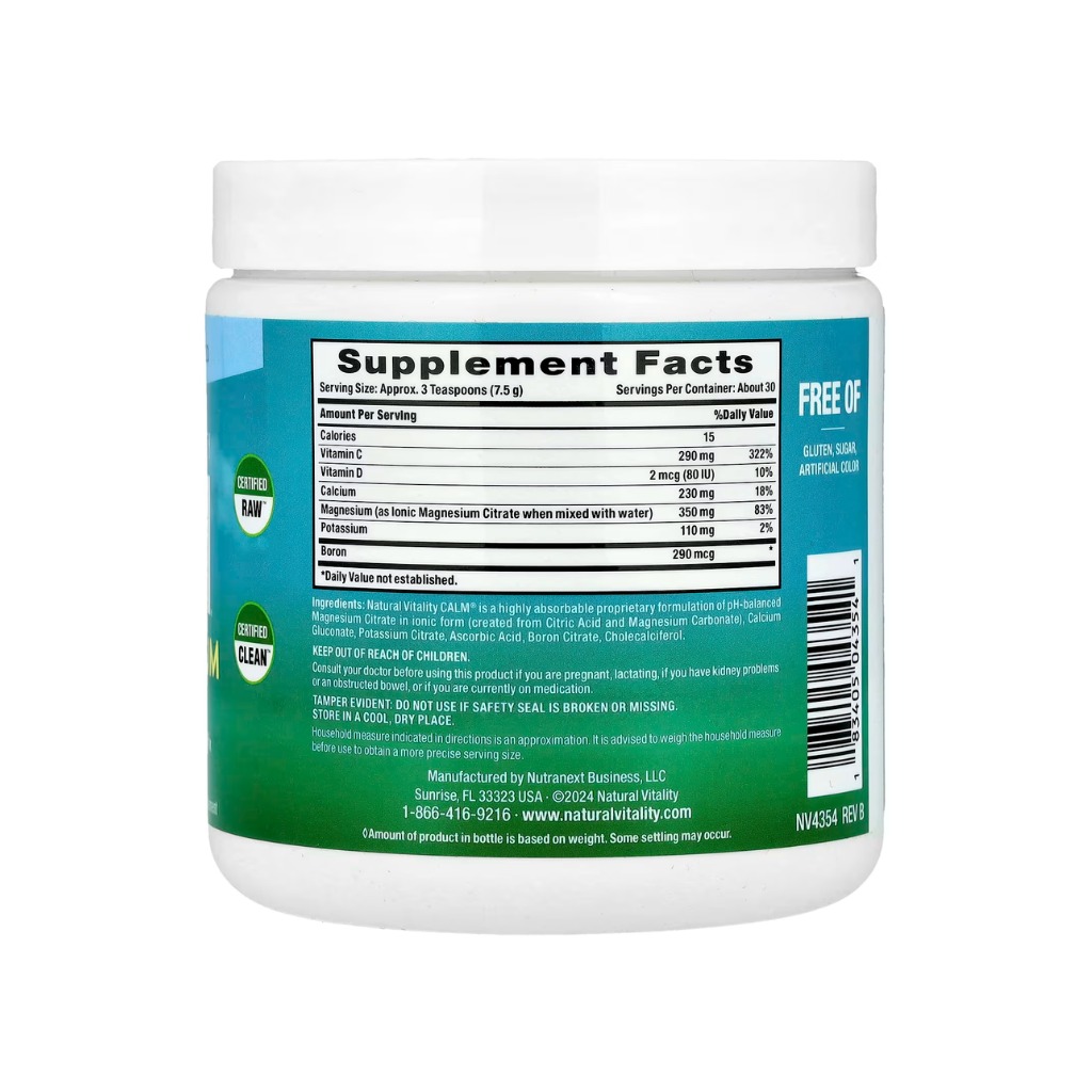 Vitamina C 290 mg, Vitamina D 2 mcg, Calcio 230 mg, Magnesio 350 mg, Potasio 110 mg, Boro 290 mcg. Fórmula patentada de alta absorción de citrato de magnesio en forma iónica y pH balanceado, creada a partir de la reacción natural entre ácido cítrico y carbonato de magnesio, que al mezclarse con agua se transforma en una solución fácilmente absorbible. Enriquecida con calcio para el soporte óseo y muscular, con saborizante natural y extracto de hoja de stevia como endulzante, sin azúcares añadidos.