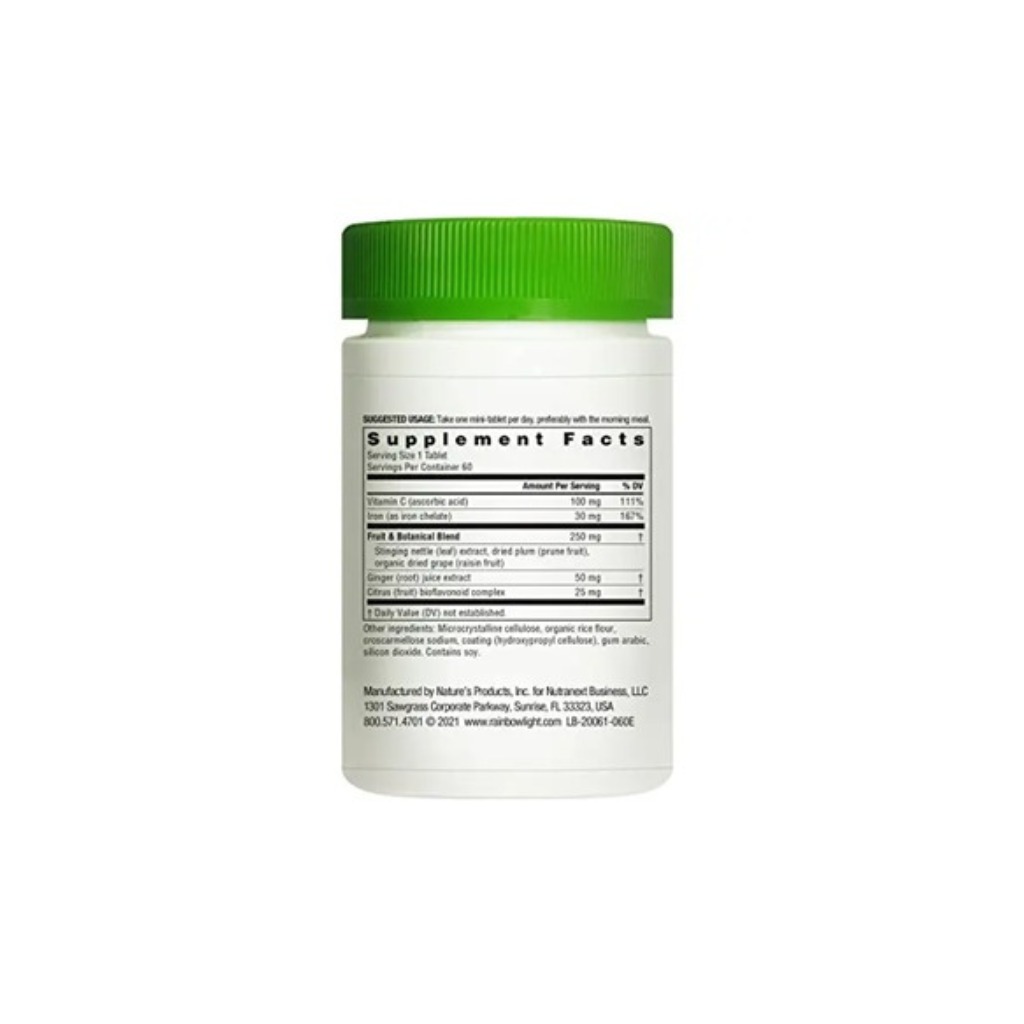 Hierro (quelato de hierro) 30 mg, Vitamina C 100 mg, Extractos Botánicos 260 mg (ciruela pasa, higo, ortiga), Polvo de jugo de jengibre 50 mg, Complejo de bioflavonoides de cítricos 25 mg.