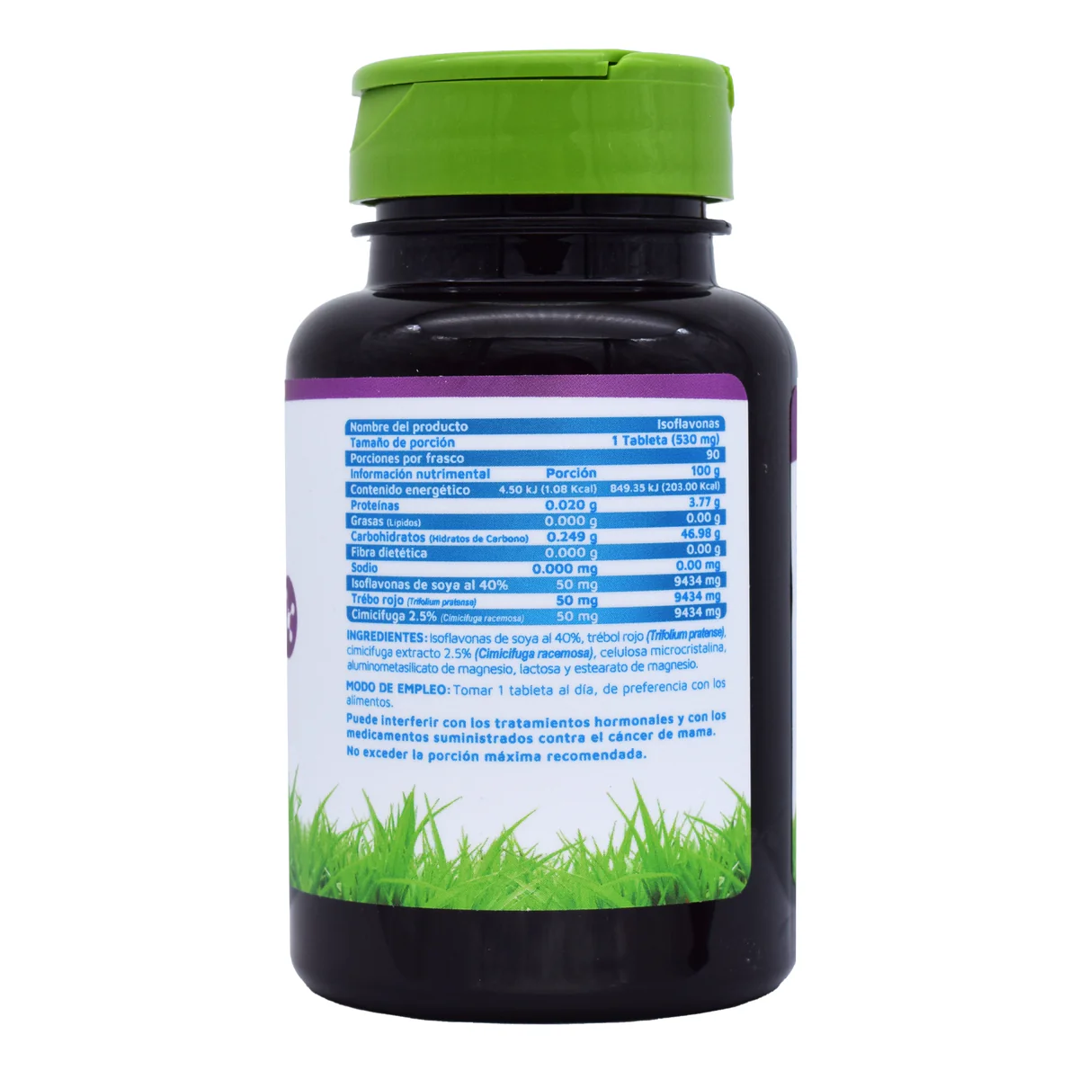 Ingredientes: Isoflavonas de soya al 40%, trébol rojo, cimicifugaextracto al 2.5%, lactosa, celulosa microcristalina, aluminometasilicato de magnaesio y estearato de magnesio